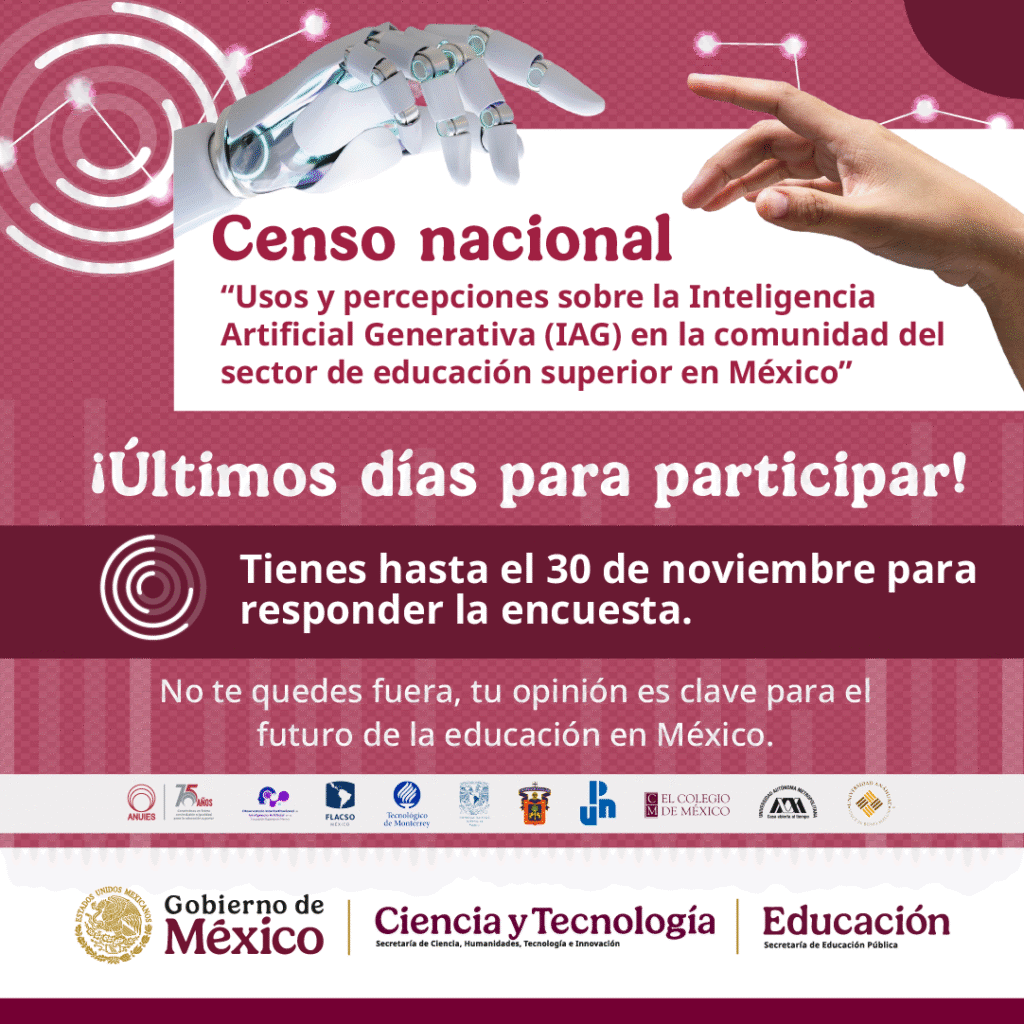 Tu opinión ayudará a construir un panorama nacional sobre la integración de la IA en la educación superior, permitiendo identificar oportunidades, desafíos éticos y académicos, así como buenas prácticas para su aprovechamiento responsable.