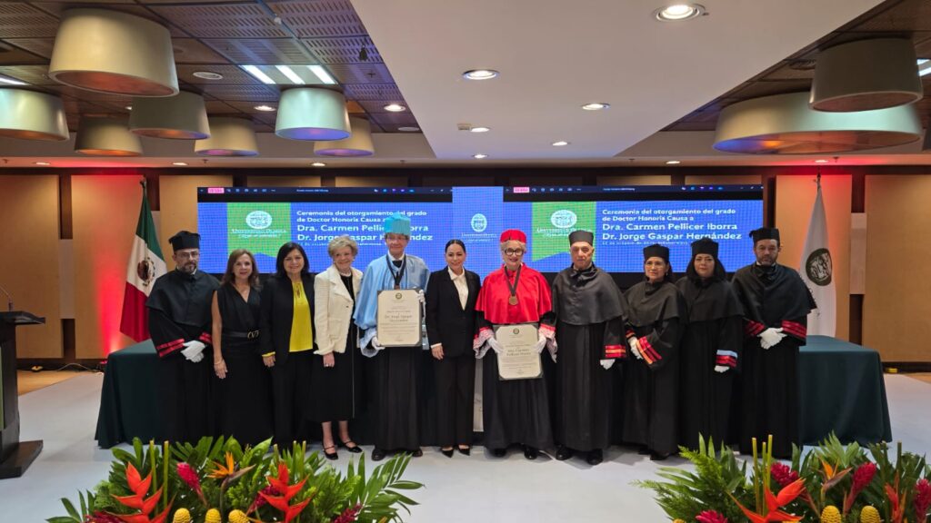 Villahermosa, Tabasco, 10 de octubre de 2025. En una ceremonia solemne celebrada en el Salón Villahermosa del Hotel Hyatt Regency, la Universidad Olmeca (UO) otorgó el grado de Doctor Honoris Causa a la Dra. Carmen Pellicer Iborra y al Dr. Jorge Gaspar Hernández, en reconocimiento a sus sobresalientes aportaciones a la educación, la salud y el bienestar social, tanto en México como en el ámbito internacional.